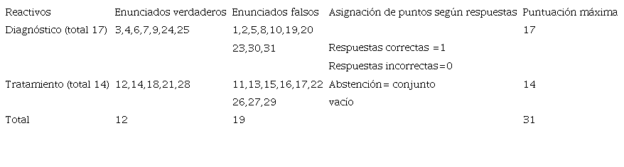Para la emisión de la evaluación de conocimientos se agruparon las preguntas dirigidas al diagnóstico (total 17) y al tratamiento (total 14), que suman 31 con que cuenta el cuestionario; así las respuestas correctas se le asignaron un punto y las respuestas incorrectas se le asignaron 0; mientras que las no respuestas se consideró un conjunto nulo o vacío y se excluyeron del análisis estadístico.