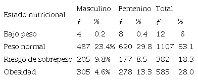 Respecto al estado nutricional, la tabla 1 muestra la categorización de acuerdo con el IMC de los participantes donde se muestra que a pesar de que el 53% de los escolares presentan normo-peso, el 46.3% se encuentran en las categorías de riesgo de sobrepeso y obesidad.