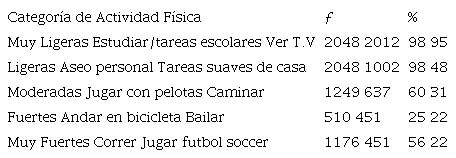 Los resultados también muestran respecto a la actividad física, que las actividades realizadas con mayor frecuencia por los escolares son de tipo muy ligero, mientras que las actividades de tipo fuerte y muy fuerte que representan mayor gasto energético son las que menos se realizan tabla 2.
