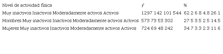 Las actividades se clasifican en cinco categorías de acuerdo con su intensidad, asignando a cada categoría un valor medio en METs (unidad de medida del gasto energético) teniendo así actividades muy ligeras (1.5 met), actividades ligeras, actividades moderadas, actividades fuertes y actividades muy fuertes16. Para conocer el índice total de actividad física realizada fue necesario calcular el gasto de energía diario en kcal/kg/día, donde se multiplica el tiempo empleado de una categoría por el valor en METs equivalente a esa categoría, de tal modo que los niveles de actividad física fueron clasificados en cuatro categorías (activos, moderadamente activos, inactivos y muy inactivos) según el gasto energético medio17.