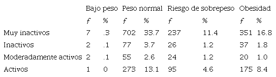 El 33.7% de los escolares en peso normal son “muy inactivos”, seguidos del 16.8% y 11.4% que presentan obesidad y riesgo de sobrepeso respectivamente.
