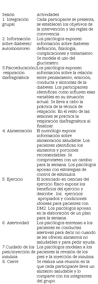 Una psicóloga educadora en Diabetes con grado de Doctorado y con formación cognitivo conductual capacitó a 10 alumnos de la licenciatura en Psicología de último semestre en la aplicación de instrumentos y en técnicas cognitivo conductuales, para aplicar el programa de intervención de 8 sesiones. También participaron alumnos de servicio social de las Licenciaturas en Nutrición y Ciencias del Ejercicio Físico, quienes fueron capacitados por profesores de sus áreas que están especializados en Diabetes. Se realizaron visitas a unidades de salud y hogares de dos comunidades rurales del noroeste de México. Los alumnos se presentaron en unidades de salud y en hogares de la comunidad, invitando a personas con diabetes para que participaran en el estudio. Cabe destacar que hubo muchas dificultades para encontrar personas interesadas en la intervención. Una vez que los pacientes aceptaron participar, se dio lectura al consentimiento informado y se llevó a cabo la entrevista inicial. En la segunda sesión se aplicaron los instrumentos y se midió la hemoglobina glicosilada. Posteriormente se formaron grupos de 5 pacientes y se reunieron en la casa de una persona para impartir las sesiones. Cada sesión tuvo una duración de dos horas y se impartió una vez a la semana. En cada sesión se llevaba a cabo la medición de glucosa sanguínea dos horas después de haber desayunado. En la tabla 1 se describen las actividades realizadas y las técnicas aplicadas en cada sesión.