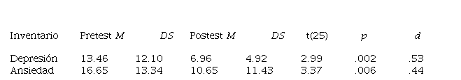 Materials and methods: Twenty-six patients (15 women and 11 men) with DM2 from two rural communities in northwestern Mexico participated. The average age was 60 years. The Beck Depression and Anxiety Inventory and Inventario de Calidad de Vida y Salud were applied, in addition to fasting glucose and glycosylated hemoglobin before and after the intervention.