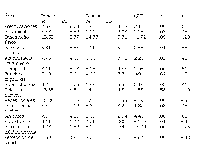 En la Tabla 3 pueden observarse los resultados de la t de Student para muestras relacionadas en las subescalas del InCaViSa. Se identifica que los pacientes presentaron una disminución estadísticamente significativa en relación a la preocupación, aislamiento, mejoró la percepción corporal, mejoró la actitud hacia el tratamiento, incrementaron sus redes sociales, el tiempo libre, la funcionalidad en la vida cotidiana, disminuyeron los síntomas, mejoró la percepción de autoeficacia para el cuidado de su salud, además de que mejoró la percepción de su calidad de vida y la percepción de su salud.