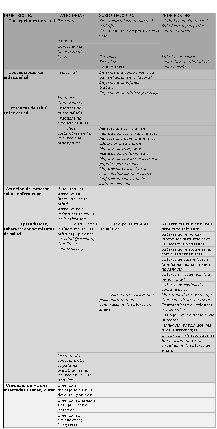 Hasta el momento, se ha podido reconocer la emergencia de dimensiones, categorías y subcategorías con sus propiedades, que abonan a la comprensión del contexto de las concepciones y prácticas de salud legas de comunidades en situación de pobreza, tal como lo expone la Tabla 1.