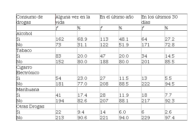 Para el consumo de drogas lícitas e ilícitas se midió mediante una tabla de prevalencias e historial de consumo de drogas, que pregunta sobre algunas drogas que pueden haber consumido los adolescentes como (alcohol, tabaco, cigarro electrónico, marihuana y otras) y son cuestionadas mediante el tiempo como alguna vez en la vida, en el último año y en los últimos 30 días12. Cuestionario de Maltrato en la Infancia (CTQ-SF) Bernstein et al.13. El cuestionario cuenta con 28 ítems y cinco subescalas las cuales son: abuso físico, abuso sexual, abuso emocional, negligencia física y emocional con opciones de respuestas tipo Likert (1. Nunca, 2. Casi nunca, 3. A veces, 4. Muchas veces y 5. Casi siempre), presentando un Alpha de Cronbach de 0.88. y el Cuestionario de Identificación de los Trastornos Debidos al Consumo de Alcohol (AUDIT). Se utilizó para medir el consumo de alcohol en el último año (consumo actual), conformado por 10 reactivos. La pregunta 1, 2 y 3 evalúan la frecuencia y cantidad de consumo de alcohol que permite identificar si las personas presentan consumo sensato. Los reactivos 4, 5 y 6 evalúan si existe dependencia en el consumo de alcohol. Los reactivos 7, 8, 9, y 10 presentan el consumo dañino o perjudicial por alcohol. El instrumento solo fue aplicado en estudiantes que han consumido alcohol en el último año, El instrumento presentó un Alpha de Cronbach de 0.8214.