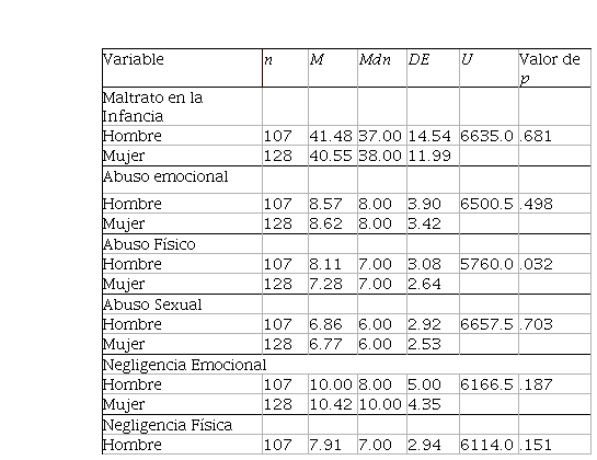 Para conocer la diferencia entre variables y subescalas, se utilizó la prueba U de Mann Whitney. En la variable de maltrato en la infancia y subescalas por sexo se encontró diferencia significativa en la subescala de abuso físico mostrando que los hombres (Mdn=7.00/ .=8.11, DE=3.08) presentaron mayor puntaje de abuso físico en comparación con las mujeres (Mdn=7.00/ .=7.28, DE=2.64) con una .=5760.0, .<0.032 tabla 2.