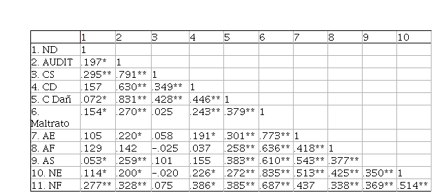 Se encontró una correlación positiva y significativa en el número de drogas consumidas con el total AUDIT, el consumo sensato, dañino, el puntaje total de maltrato, el abuso sexual, negligencia emocional y negligencia física. En la relación del puntaje total del AUDIT se encontró correlación positiva y significativa con el puntaje total de maltrato, abuso emocional, abuso sexual, negligencia emocional y negligencia física. De acuerdo a la subescala de consumo dependiente se encontraron relaciones positivas y significativas con el abuso emocional, negligencia emocional y negligencia física. En el consumo dañino se encontraron relaciones positivas y significativas con todas las subescalas de maltrato en la infancia tabla 3.