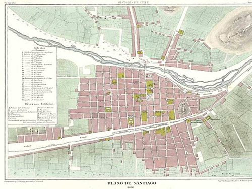Dimensión ideológica. En primer lugar se trabajó las Sesiones de Los Cuerpos Legislativos (SCL), entre el año 1810 y 1845; fueron revisadas más de 3.500 reuniones contenidas en el repositorio digital abierto “wikisource”3; en relación al plano urbano de Santiago, se consideró el diseñado por Claudio Gay, como se observa en la figura N° 1.