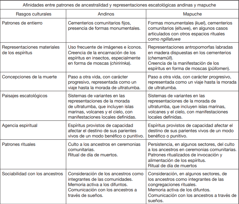 Los antecedentes expuestos muestran un modelo de ancestralidad fuerte, afín al patrón andino de culto a los antepasados. Por la continuidad de la sociabilidad entre vivos y muertos; por la agencia que se les atribuye a estos; por la persistencia de manifestaciones del culto a los ancestros en las rogativas; por la profundidad y extensión de los antecedentes etnohistóricos, arqueológicos y lingüísticos del mismo; y por las formas de memorialización de los difuntos, esta adscripción es clara. Junto a ello, el análisis de las representaciones escatológicas del destino de ultratumba muestra el registro de un sistema de variantes similares al mundo andino. Este correlato no implica necesariamente vínculos de origen, pero sí muestra una cotradición: la extensión a lo largo del cordón cordillerano de concepciones similares del destino humano tras la muerte.