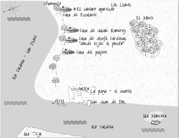 Los relatos disponibles en el proceso de Escalante dibujan este asentamiento complejo y dinámico. Los ejes que lo articulan son la plaza-presidio y la casa de Escalante, distante de la primera cerca de una legua. Se distingue el muelle de la plaza donde él desempeña su oficio de carpintero de ribera, el castillo de Mancera desde donde se moviliza el capitán Luque y el monte, donde Pedro recurre al trabajo de la madera como parte de las labores adicionales y “civiles” que puede realizar, tal como lo han permitido e incentivado las Ordenanzas Políticas. Como un lugar que no se visita en el proceso, pero que indudablemente porta una significativa potencia simbólica se mencionan “los llanos”, desde donde los indios traerían estos prodigiosos cántaros (Figura 2).