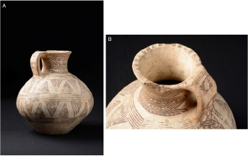 Tipológicamente se identifican distintas variedades formales que incluyen platos, ollas, vasos y jarros, además de formas complejas como modelados antropomorfos y zoomorfos. Entre éstos la forma más frecuente es la de jarros de diversos tamaños e inclusive grandes cántaros como meshenes. Respecto de su decoración pintada se han reconocido al menos ocho variedades en cuanto a la composición formal que definen los dibujos sobre la pieza, siendo el más común el de triángulos opuestos arriba-abajo con dos campos en el cuerpo y el cuello adornado con chevrones o la sucesión de otros motivos geométricos (Figura 3). Se ha destacado la visualidad de estas piezas y sus contextos de uso que las convirtieron en ítemes seleccionados para representar la riqueza y prestigio del que sirve y la deferencia hacia el comensal que era atendido con estas vasijas (Adán 2014: 204, 235-237).