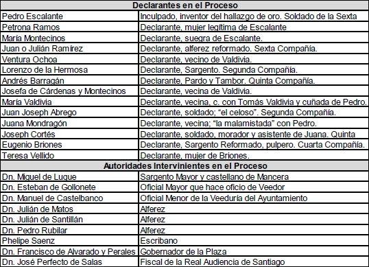 El proceso fue conducido por el sargento mayor interino Miguel de Luque, también castellano de Mancera, por mandato del gobernador a la fecha, Francisco de Alvarado y Perales. Las declaraciones se inician con las de la mujer de Escalante, Petrona Ramos, quien señala haber sido informada por su marido de haber hallado éste “pocos días antes del de la Cruz”, en mayo, un “cantarito” medio lleno de granos de oro, información que recibe estando con su madre María Montecinos. Escalante les habría relatado la situación y que el cántaro lo había dejado escondido para luego volver al cuartel. Al retorno de su marido, Petrona señala que ambos recorrieron el terreno sin hallar vestigio alguno. La siguiente declaración es la del propio Escalante. Señala que el hallazgo habría ocurrido el 30 de abril junto a un arroyo distante de su casa unos 40 o 50 pasos y que el cántaro “tenía un palmo de alto y algo barrigudo de estos que vienen de los Llanos7; blancos y pintados”. Además de habérselo contado a su mujer y suegra y no hallarlo luego, tal como declaró Petrona, informó haber concurrido luego a la casa del alférez Julián Ramírez donde también se encontraba Ventura Ochoa y haberles relatado a ambos los hechos.