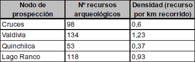 Los datos anteriores dialogan con el registro arqueológico con el cual contamos a la fecha. En efecto, el reconocimiento del área a través de una prospección sistemática y hallazgos aislados en el territorio que denominamos nodo arqueológico plaza de Valdivia, nos ha permitido documentar una importante densidad de recursos arqueológicos (sitios y hallazgos aislados) distribuidos tanto en lo que fuera el asentamiento urbano del siglo XVI como en los contornos inmediatos y más dilatados del área central. Visto a nivel regional, como era de esperar, el nodo de Valdivia destaca como el sector más densamente ocupado de la jurisdicción de Valdivia con una media de 1,23 recursos arqueológicos por cada kilómetro lineal recorrido (Tabla 2).