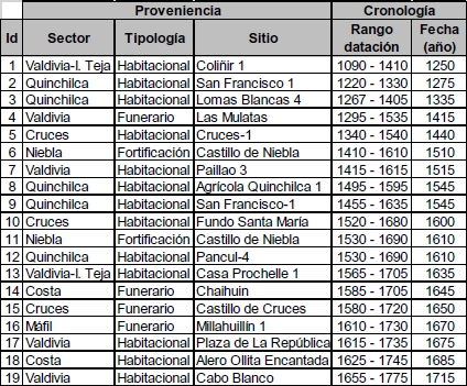 En términos cronológicos y con los datos con que contamos a la fecha, la cerámica de estilo Valdivia arranca en el siglo XIII con expresiones hasta el siglo XVIII (Tabla 3).