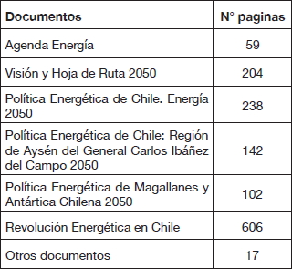 La recopilación de información consistió en una revisión de fuentes de información secundaria de tipo gubernamental, científica y técnica en que participaron los actores de la red tecnoepistémica E2050. El material seleccionado (Tabla 1), consta de los planes estratégicos informados por el Ministerio de Energía entre los años 2014 - 2018 y las principales publicaciones científicas. En esta línea, cabe destacar el libro “Revolución Energética en Chile” (Pacheco 2018b), compendio de artículos en que los miembros de E2050 describen, detalladamente, los procedimientos realizados en la transformación energética. De esta forma, la investigación contó con los antecedentes empíricos necesarios para concretar los objetivos propuestos.