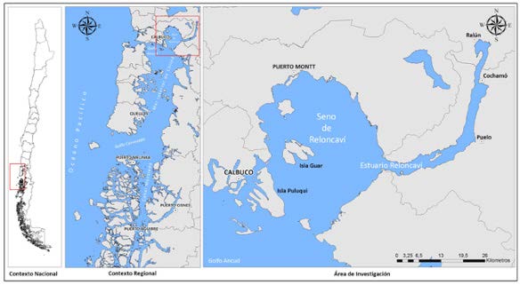 La comuna de Calbuco se ubica a 56 kilómetros al sur-poniente de la ciudad de Puerto Montt, en la coordenada geográfica 41°46’ latitud sur y 73°07’ longitud oeste, con una superficie total de 590,8 km² (ver figura 1). Con respecto a su toponimia, Calbuco proviene del mapudungun “kalfüco” significa “agua azul”, siendo una de las comunas que componen la provincia de Llanquihue, perteneciente a la región de Los Lagos. Con dos sectores geoespaciales diferenciados, uno peninsular y otro insular, el archipiélago de Calbuco está formado por catorce islas, básicamente rurales, cuya principal actividad productiva es la pesca artesanal, la recolección de orilla y la agricultura bordemarina. Entre sus islas se encuentran: Huar, Puluqui (la de mayor superficie y población), Chidhuapi, Tabón, Mayelhue, Lín, Quenu, Quihua, Huapi Abtao, Chaullín, Caicué o lagartija, Tautil y Queullín, la capital comunal corresponde a la ciudad homónima, que a su vez es el único centro urbano de la comuna y -después de Puerto Montt- uno de los principales centros de actividad marino-industrial de la región de Los Lagos (Caro 2018).