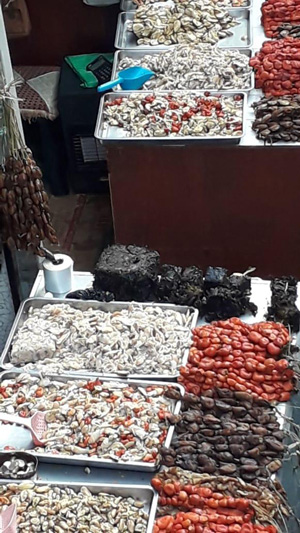 La producción de chaitunes responde al modo en cómo los habitantes han solucionado el problema de la conservación de los productos marinos. A diferencia de otros que frecuentemente se comercializan en los mercados locales, el chaitún es un producto elaborado. Es decir, la recolección de una diversidad de especies bentónicas del bordemar, las cuales se desconchan, se cuecen e incluso se congelan en la casa de las mujeres (ellas mismas lo realizan) y luego se derivan o se llevan a los espacios o mercados de comercialización (ver fotografía 1). Es decir, la cocción permite que el marisco se conserve algunos días. Cabe consignar que la cocción, junto al ahumado y a la deshidratación, es una estrategia de conservación de alimentos de larga data en el mar interior (Saavedra y Macías 2012; Álvarez et al. 2015). Por cierto, en el relato del autor podemos refrendar lo que acabamos de plantear: el luche (Pyropia sp), al igual que el chaitún, también forma parte de repertorio de alimentos típicos del mar interior. Se trata de un alga deshidratada muy utilizada en caldillos y sopas de mariscos (igualmente visible en la fotografía 1, en la parte superior del segundo mesón).