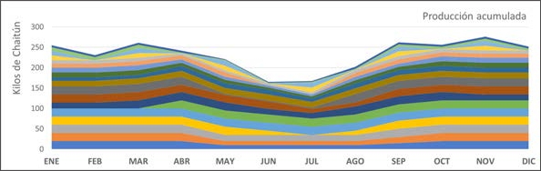 La producción de chaitunes se realiza durante todo el año y el volumen mensual elaborado considera la realización de varias jornadas marisqueo. La producción individual, consignada en la figura 2, varía con mínimos de 5 kg y máximos de 30 kg mensuales, con producciones máximas en los meses de primavera y verano y mínimos en otoño e invierno, siendo la producción mensual acumulada por el grupo de mariscadores siempre superior a 150 kilos y con valores máximos en torno a los 270 kilos, lo anterior da cuenta de la persistencia de la actividad pese a los bajos volúmenes individuales de producción.
