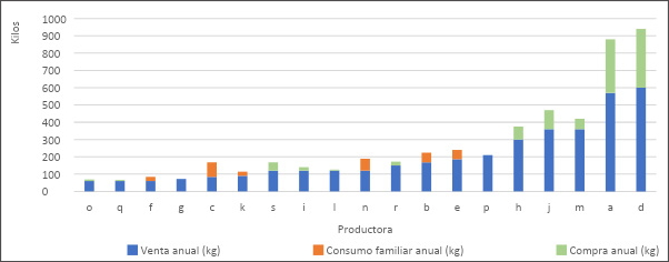 De acuerdo con nuestros datos, la producción individual es variable con mínimos de 50 kg y máximos de 300 kg al año. Aquellas mujeres que compran el producto a otras para comercializarlo fuera de la isla alcanzan valores anuales de producto comercializado entre 300 kg y 900 kg al año. Debido a que en algunos casos el volumen que las productoras declaran elaborar es mayor que el que declaran vender, se estima que esta diferencia podría corresponder al consumo familiar (figura 3).