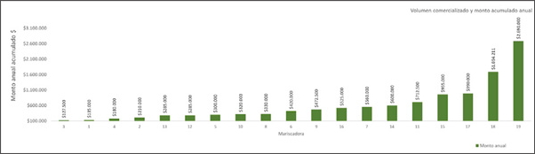 La figura 3 da cuenta de la producción anual del chaitún según el volumen destinado al consumo familiar y el volumen comprado a otras productoras dentro de la isla Puluqui. El precio local (años 2019 y 2020) es en torno a los $2.000 el kilo y es comercializado fuera de la isla a $4.000 el kilo, los formatos de comercialización son: Bolsas de 1 kilo y envases plásticos de 250 gramos. En este sentido, el monto generado por la venta es concordante con el volumen comercializado, de tal forma que hay algunas productoras que generan montos mayores debido a que venden fuera de la isla, a mayor precio por kilo y a que complementan sus ganancias comprando a otras mariscadoras, esta última derivación en la distribución puede verse representada en la figura 4.