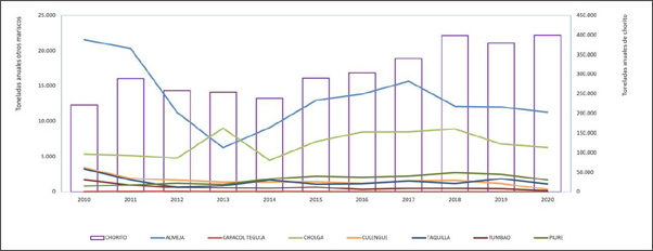 Al cotejar los componentes del chaitún con su importancia cuantitativa en los desembarques de la pesca artesanal bentónica, observamos que en su mayoría se trata de especies de baja demanda, a excepción de chorito; no obstante, en este caso, se trata del chorito silvestre o cultivado artesanalmente. En cualquier caso, el chaitún no forma parte de los registros oficiales de desembarque pesquero artesanal. Aun así y a modo de referencia, véase en el siguiente gráfico (figura 5) los volúmenes de desembarques oficiales de los mariscos que suelen conformar los chaitunes.