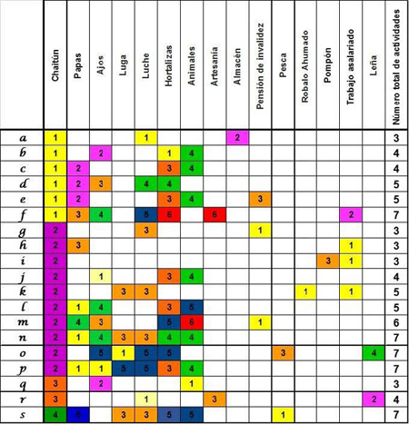 Las mujeres entrevistadas realizan entre 3 y 6 actividades para generar ingresos. Las más comúnmente realizadas son: chaitunes (19 mujeres), hortalizas (12 mujeres), papas, ajos, luche y animales (10 mujeres en cada actividad representada).