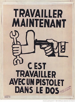 Anónimo. 1968. “Travailler maintenant c’est travailler avec un pistolet dans le dos”. Afiche. Atelier populaire ex Ecole des Beaux-Arts. Disponible en Gallica.bnf.fr. (Consultado en agosto de 2021).