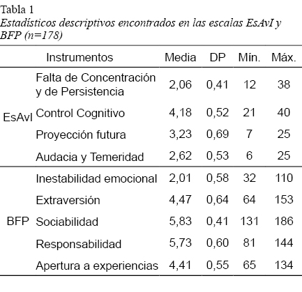 Inicialmente serán presentados los estadísticos descriptivos de los instrumentos utilizados, conforme se indica en la Tabla 1. Considerando que los factores de ambos instrumentos poseen diferente cantidad de ítems, las medias son presentadas pudiendo variar de 1 a 5 en el caso de la EsAvI y de 1 a 7 para la BFP.