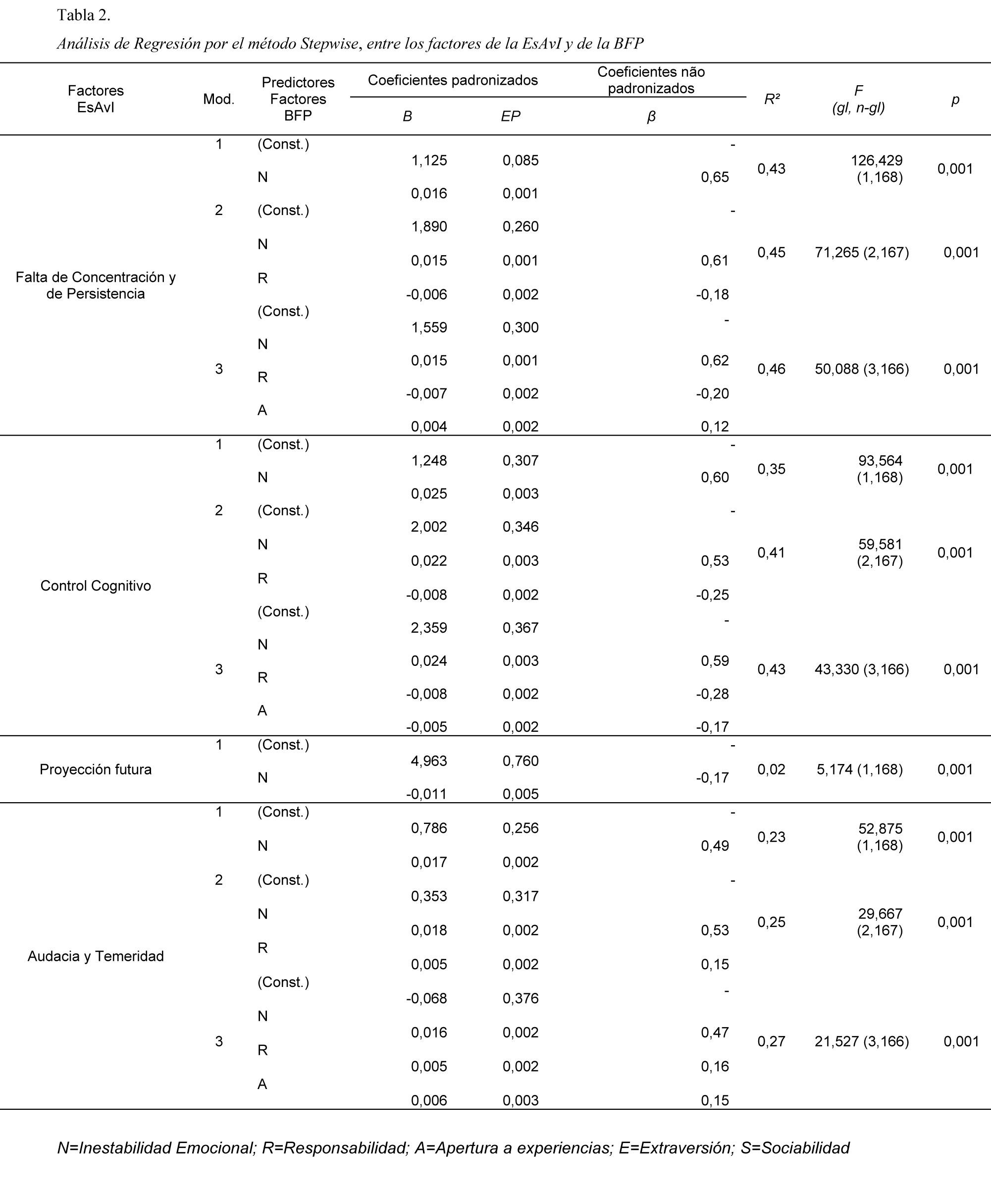 En conformidad con la propuesta del trabajo, se presentan los resultados del análisis de regresión realizado, considerando como predictores los factores y las facetas del BFP, en relación a cada uno de los factores de la EsAvI. Antes de iniciar el análisis de regresión, se realizaron pruebas para verificar la multicolinearidad fueron realizadas, y no fueron encontrados valores que inviabilizasen la interpretación de los coeficientes encontrados, o sea, valores de VIF (Variance Inflation Factor) ajustados (Tabachinick & Fidell, 2007). En la Tabla 2 se encuentran los resultados.