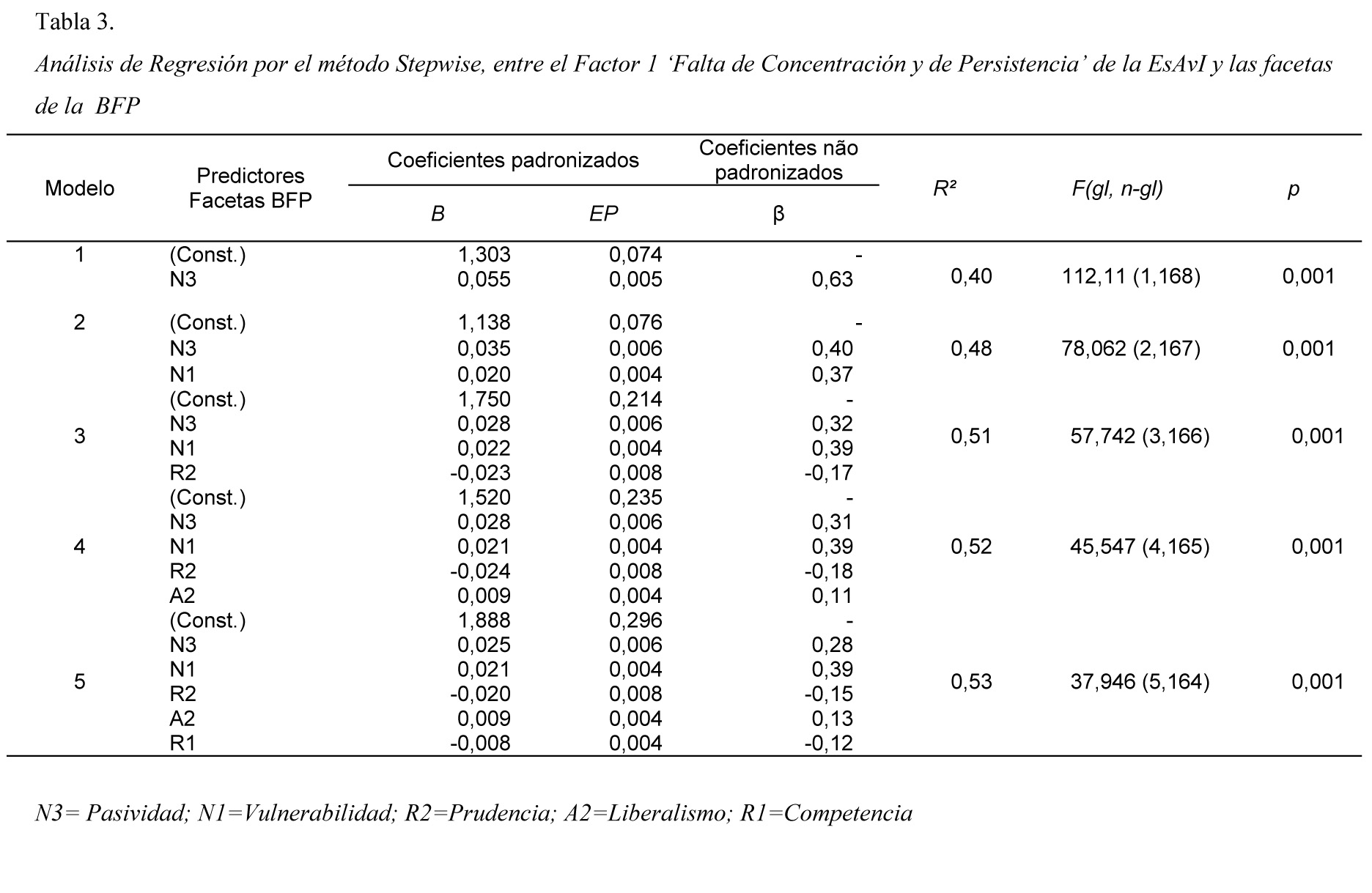 Analizando la Tabla 3 se observa la formación de 5 modelos predictivos en relación al factor ‘Falta de Concentración y de Persistencia’. En líneas generales, se visualiza que las facetas provenientes del factor ‘Inestabilidad emocional’ (N) y ‘Responsabilidad’ (R) fueron las más presentes en los modelos. En el modelo 1, la variable independiente que mejor predijo fue la faceta N3 (Pasividad), del factor Inestabilidad emocional, que trata de las características de personas que tienden a procrastinar actividades o dificultad de ejecutar tareas y explicó 40% de la variable. En el segundo modelo de la faceta N1 (Vulnerabilidad), aumenta la variancia explicada al 48%, incluyendo en esa variable las características relacionadas con fragilidad emocional. El modelo siguiente tuvo la participación de la faceta R2 (Prudencia), y el cuarto modelo incluyó la faceta A2 (Liberalismo), presentando aumento de 3% y 1% en la variabilidad, respectivamente. Por lo tanto, se puede observar que la relación de R2 con el factor de la EsAvI se da de manera inversa. El último modelo revelado quedó compuesto por las cuatro facetas ya presentadas y también la R1 (Competencia), cuya predicción final fue de 53%, y la asociación es inversa. Esas tres facetas aumentaron poco la variabilidad, a pesar de haber participado significativamente del modelo predictivo.