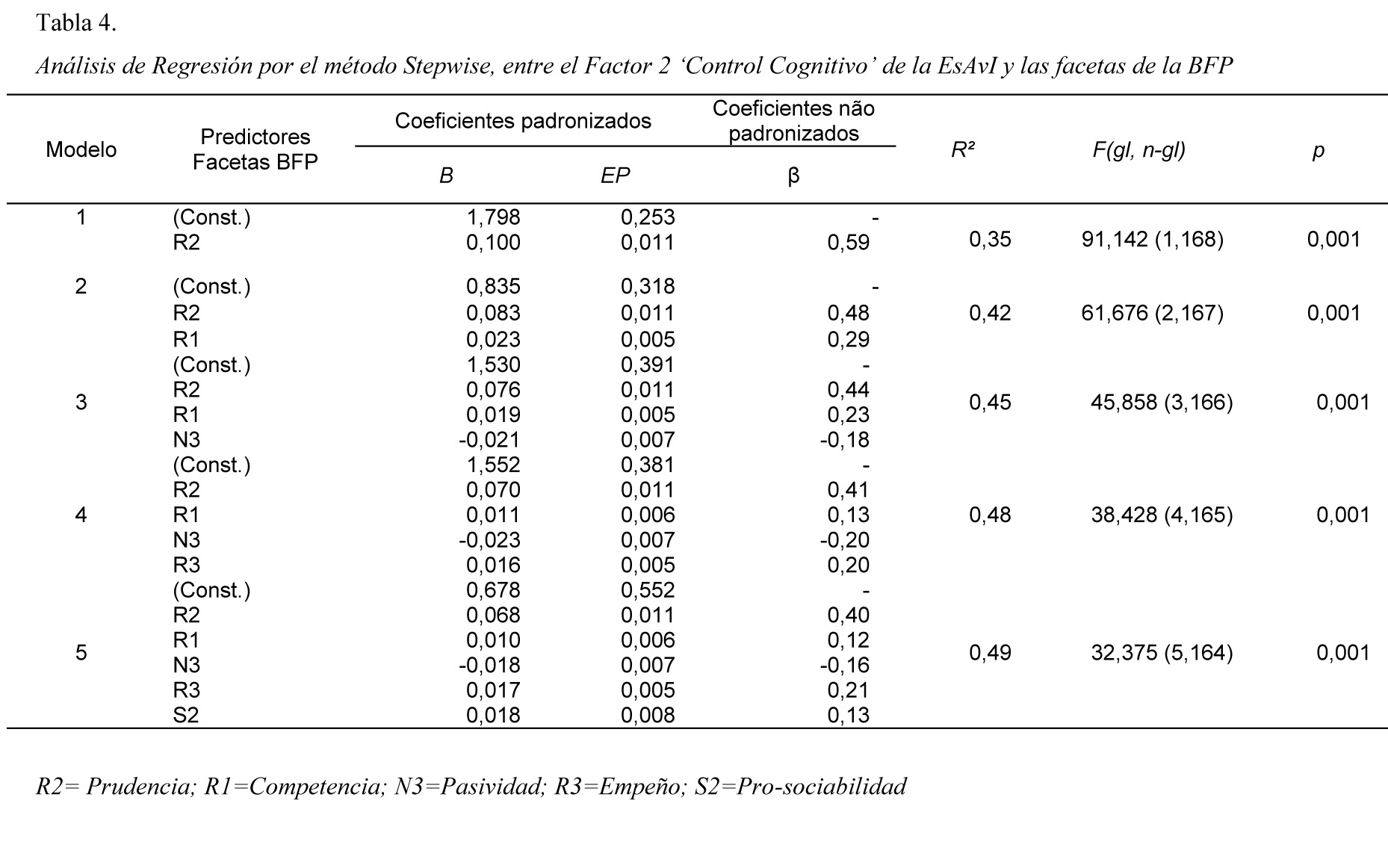 Teniendo en vista los modelos formados para el primer factor de la EsAvI, a continuación se presenta la Tabla 4, con los análisis de regresión realizados en el segundo factor, que refiere al ‘Control cognitivo’.