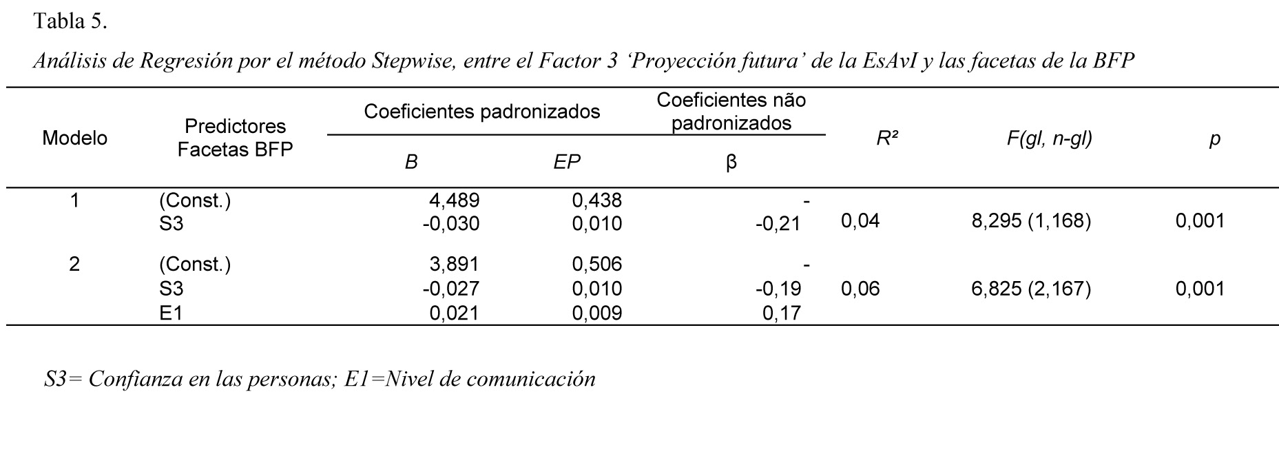 De acuerdo con lo indicado en la Tabla 5, el factor ‘Proyección futura’ fue el que presentó la menor cantidad de modelos predictores y, por lo tanto, reveló la menor variancia explicada a partir de las facetas de la BFP. El primer modelo contó con la inclusión de la faceta S3 (Confianza en las personas), y el modelo siguiente con la E1 (Nivel de comunicación), cuyas predicciones fueron de 4% y 6%, respectivamente. Así, las características que se refieren a personas que no confían o creen en los otros, asociadas a los rasgos de personas comunicativas y expansivas, contribuyen, aunque mínimamente, con la predicción de la capacidad de planear acciones cuyos efectos no se restringen al momento presente.
