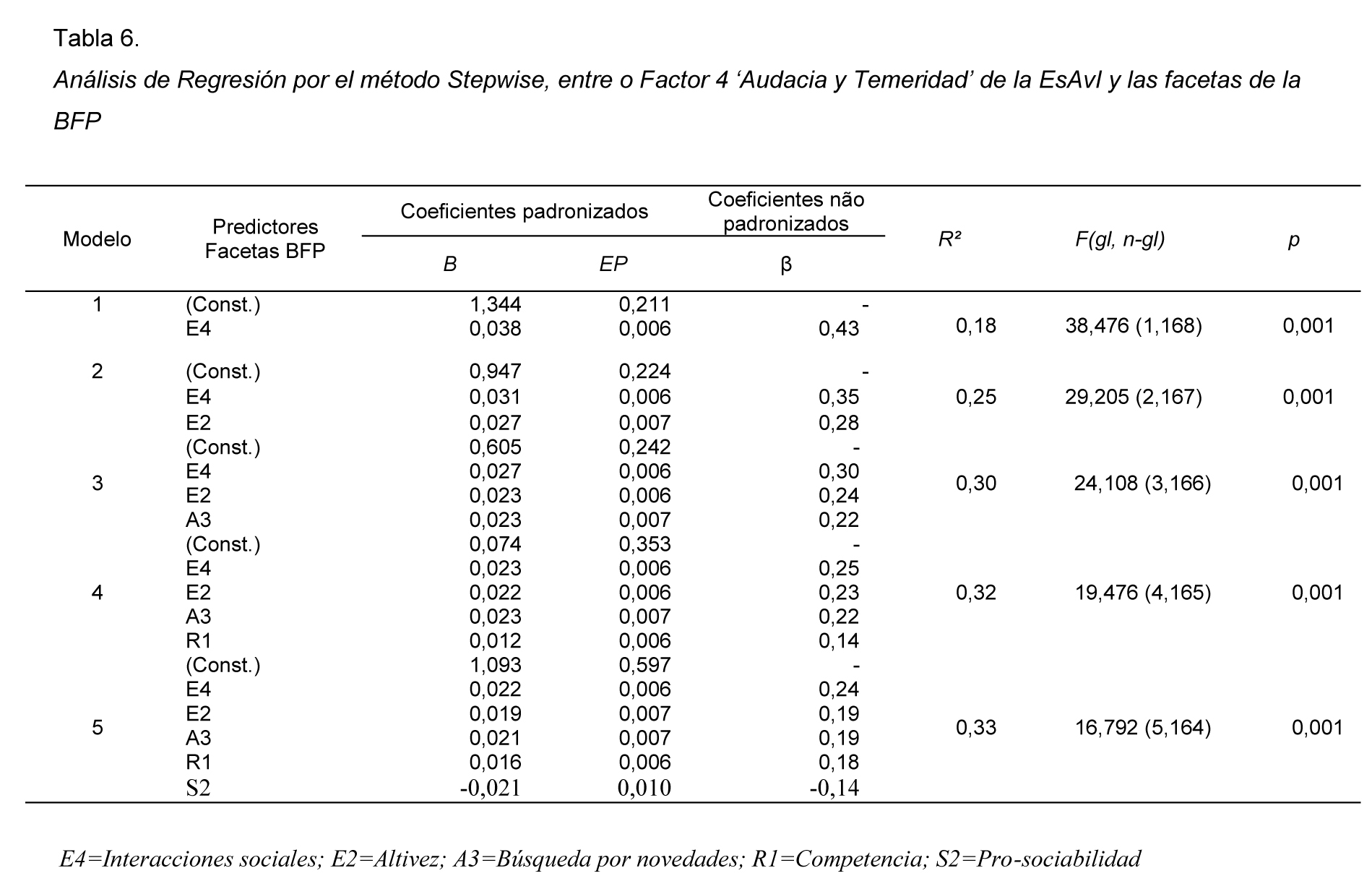 Así como los factores ‘Falta de Concentración y de Persistencia’ y ‘Control Cognitivo’, en el factor ‘Audacia y Temeridad’ de la EsAvI existió la formación de 5 modelos predictores. El primer modelo observado tuvo 18% de la variancia explicada por la faceta E4 (Interacciones sociales), que representa personas que procuran interrelacionarse socialmente. El último modelo, con una varianzaxplicada de 33%, tiene un mayor peso de las facetas E2 (Altivez), A3 (Búsqueda por novedades), R1 (Competencia) y S2 (Pro-sociabilidad), que presentan, respectivamente, la percepción valorizada de su capacidad, la preferencia por experimentar nuevas situaciones y acciones, el reconocimiento de empeño en el cumplimiento de metas y, por fin, comportamientos de riesgo, confrontación con la ley y actos contra la moral.