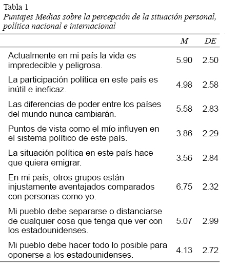 - Escala de percepción de política nacional e internacional (Pratto et al., 2012): está compuesta por 8 ítems que evalúan creencias sobre la participación política, el empoderamiento político de los ciudadanos, el poder político nacional e internacional, y la relación con los Estados Unidos. El continuo de respuesta es de 1 (Totalmente en desacuerdo) a 10 (Totalmente de Acuerdo). Algunos ítems de esta escala son: la participación política en este país es inútil e ineficaz; en mi país, otros grupos están injustamente aventajados comparados con personas como yo; las diferencias de poder entre los países del mundo nunca cambiarán y mi pueblo debe separarse o distanciarse de cualquier cosa que tenga que ver con los estadounidenses.