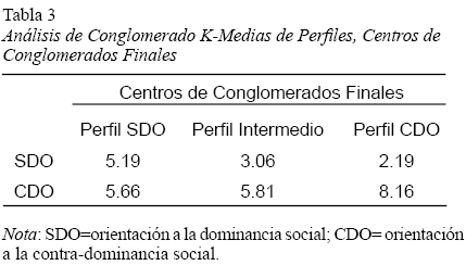 A partir de este hallazgo, se realizó un análisis de Conglomerado de K-Medias con 3 conglomerados (Tabla 3) para categorizar a los participantes en 3 perfiles según los puntajes de SDO y CDO: 1. Perfil SDO: está compuesto por aquellos participantes que poseen valores altos en SDO y los valores más bajos en CDO; 2. Perfil Intermedio: está compuesto por los participantes con valores intermedios de SDO y CDO; y 3. Perfil CDO: está compuesto por aquellos participantes que poseen los puntajes más altos en CDO y más bajos en SDO.