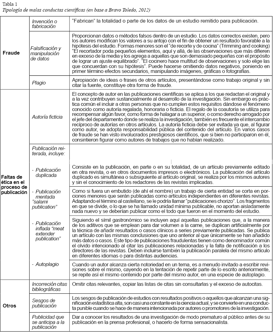 Ya nos hemos ocupado de describir las diferentes variedades de inconductas investigativas en un artículo anterior (Franca, 2014a). No obstante, estimamos útil que el lector tenga presente la “taxonomía” (ver Tabla 1) de las diferentes faltas éticas relacionadas con la investigación formuladas por Bravo Toledo (2012) y expuestas en la tabla adjunta, puesto que, de una u otra manera, serán aludidas en este artículo.