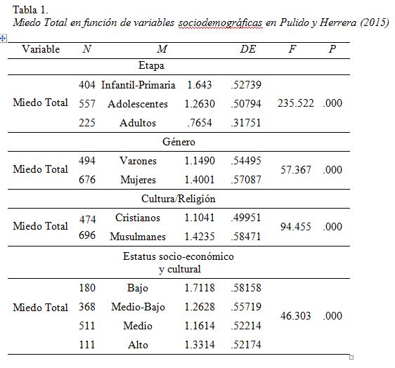 Es importante considerar las consecuencias desfavorables que pueden ir asociadas a este tipo de estados emocionales de carácter negativo, que se relacionan con la evitación de muchas situaciones o la exposición a ellas sufriendo un intenso malestar, especialmente durante la adolescencia. Es por ello que este periodo se puede considerar como etapa de riesgo (Gómez-Ortiz, Casas, & Ortega-Ruiz, 2016). La edad es uno de los elementos que influyen de forma clara sobre la prevalencia de este tipo de problemas emocionales (Franco, Pérez, & de Dios, 2014 y Soriano & González, 2013). Los resultados (ver tabla 1) obtenidos por Pulido y Herrera (2015) reflejan que la edad tiene una clara influencia, siendo éstos inversamente proporcionales; a medida que el sujeto se va desarrollando emocionalmente, desciende su manifestación de miedo. La muestra Infantil obtuvo una media de M=1.60, la Adolescencia una media de M=1.26 y los Adultos M=.765, no sólo cumpliéndose este decrecimiento en las puntuaciones totales de Miedo, sino en los factores. En todos los casos la muestra infantil presentaba los niveles más altos (Miedo a lo Desconocido: 1.24, a la Muerte: 2.1, a los Animales: 1.78, a la Crítica: 1.17 y Miedos Escolares: 1.63), seguida por los adolescentes (Miedo a lo Desconocido: .77, a la Muerte: 1.90, a los Animales: 1.04 y Miedos Escolares: 1.35). Solamente en la categoría de Miedos Médicos (.65) los adultos presentan niveles más altos que los adolescentes. Las diferencias resultaron estadísticamente significativas en el Miedo Total (p=.000), a lo Desconocido (p=.000), a la Muerte (p=.000), a los Animales (p=.000), a la Crítica (p=.000), los Miedos Escolares (p=.000) y los Miedos Médicos (p=.000), siendo superiores las puntuaciones entre los más jóvenes (Pulido & Herrera, 2016).