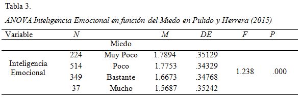 De esta forma, se llega a comprobar cómo el miedo puede incidir, de manera evidente, en el desempeño emocional del sujeto. De esta manera, las competencias emocionalmente ajustadas favorecerían la disminución progresiva del nivel de miedo (Caballero-Dominguez et al., 2015; Gutiérrez & Expósito, 2015). El miedo adquiere, de esta manera, un carácter negativo (ver tabla 3).