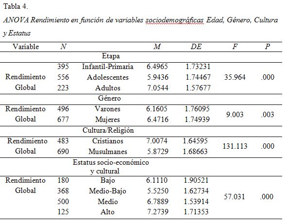 En el Rendimiento se han hallado niveles medios (sus relaciones con las variables sociodemográficas se presentan en la tabla 3, donde se muestra el ANOVA considerando las variables Edad, Género, Cultura y Estatus).