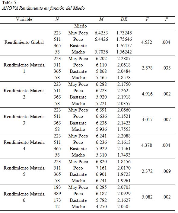 El grupo que refleja niveles mayores de Miedo es el que alcanza la media más baja, tanto a nivel general, como en cada una de las diferentes materias (la Materia 1: 5.46, la Materia 2: 5.22, la Materia 3: 5.93, la Materia 4: 5.31, la Materia 5: 6.74 y la Materia 6: 4.25). Teniendo en cuenta la estadística inferencial, se llega a la conclusión de que, el Miedo influye la Media de Rendimiento Total (p=.004), el Rendimiento en la Materia 1 (p=.035), el Rendimiento en la Materia 2 (p=.002), el Rendimiento en la Materia 3 (p=.007), el Rendimiento en la Materia 4 (p=.004) y el Rendimiento en la Materia 6 (p=.002), aumentando la calificación a menor nivel de miedo, influyendo negativamente en el rendimiento (ver tabla 5).