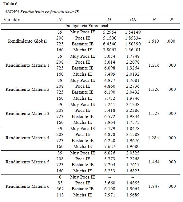 A medida que aumenta el nivel de IE aparecen calificaciones más altas. En el apartado inferencial (ver tabla 6), se constata la relación entre la Inteligencia Emocional y el Rendimiento, dado que se encontraron diferencias significativas la Media de Rendimiento Total (p=.000), el Rendimiento en la Materia 1 (p=.000), el Rendimiento en la Materia 2 (p=.000), el Rendimiento en la Materia 3 (p=.000), el Rendimiento en la Materia 4 (p=.000), el Rendimiento en la Materia 5 (p=.000) y el Rendimiento en la Materia 6 (p=.000). En todos los casos los sujetos que tenían mayor nivel de Inteligencia Emocional.