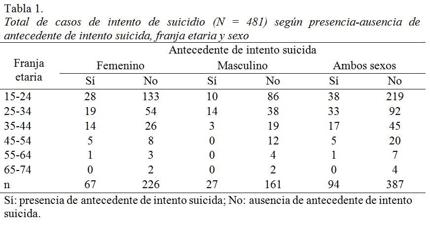 Del total de pacientes asistidos por intento de suicidio, sólo el 19.54% había realizado uno o más intentos suicidas anteriores. La razón entre casos sin antecedente - con antecedente de intento suicida fue de 3.37 a 1 en el sexo femenino y de 5.96 a 1 en el masculino. La razón entre sexos (femenino-masculino) fue de 2.48 a 1 en casos con antecedente de intento suicida y de 1.40 a 1 en casos sin ese antecedente (ver tabla 1). Las diferencias según sexos fueron estadísticamente significativas (χ2 (1) = 5.27, p< .05). Antecedente de intento suicida caracterizó diferencialmente al sexo femenino respecto del masculino, aunque la fuerza de la asociación hallada fue muy débil (V = 0.10).