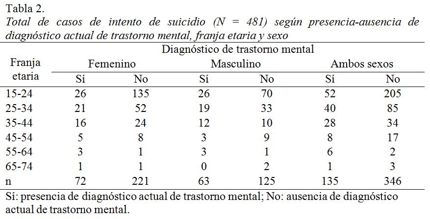 Del total de pacientes asistidos por intento suicida, sólo el 28.07% tenía diagnóstico de trastorno mental. La razón entre casos sin diagnóstico - con diagnóstico de trastorno mental fue de 3.07 a 1 en el sexo femenino y de 1.98 a 1 en el masculino. La razón entre sexos (femenino-masculino) fue de 1.14 a 1 en casos con diagnóstico de trastorno mental y de 1.77 a 1 en casos sin esos diagnósticos (ver tabla 2). Las diferencias según sexos fueron estadísticamente significativas (χ2 (1)=4.52, p< .05), aunque la fuerza de la asociación hallada fue muy débil (V = 0.10). La presencia de diagnóstico de trastorno mental caracterizó diferencialmente al sexo masculino respecto del femenino.