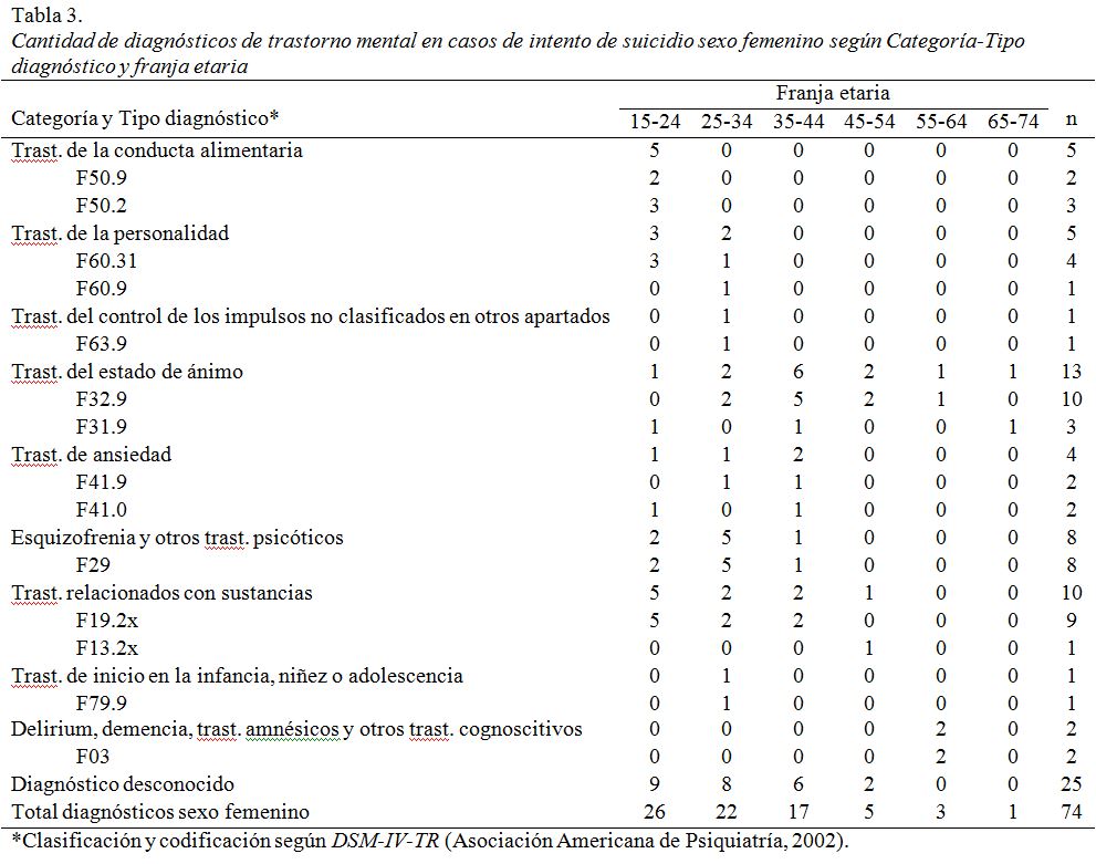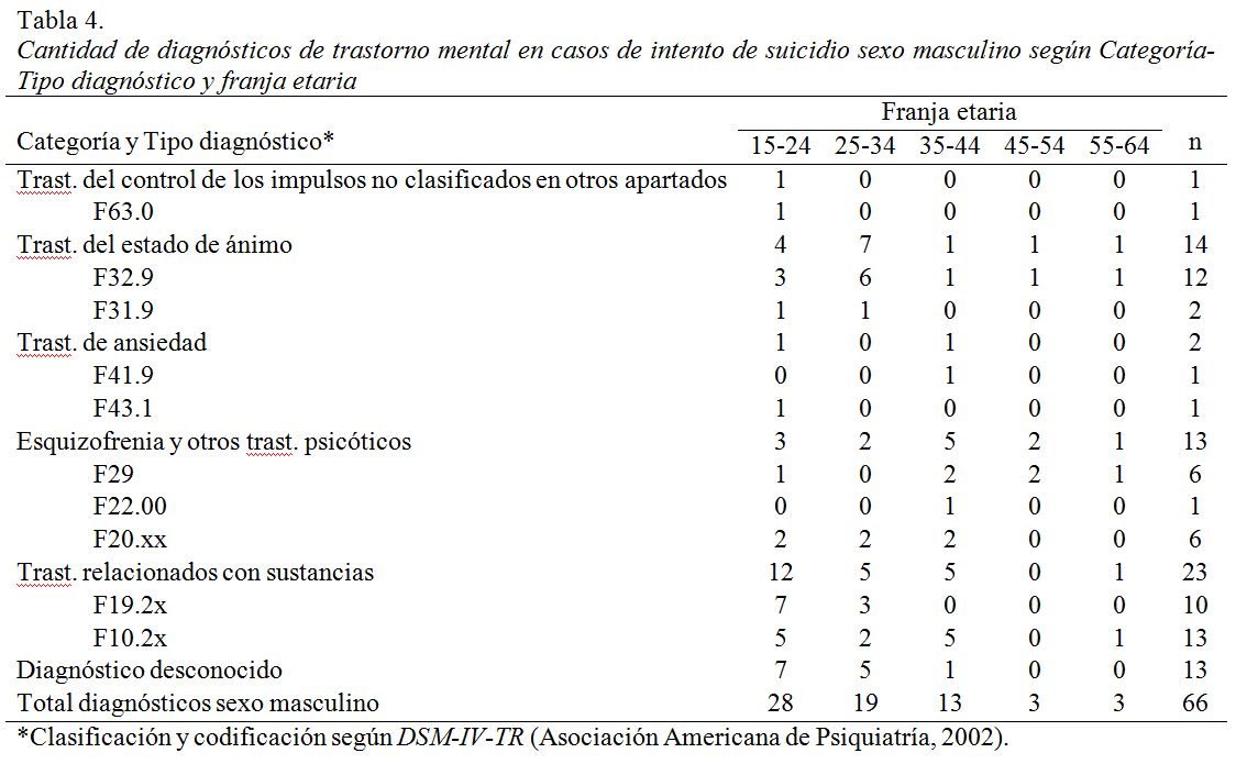 - Tipos y Categorías diagnósticas: se agruparon los diagnósticos de trastorno mental en función de Tipos y Categorías diagnósticas según la clasificación y codificación del DSM-IV-TR (Asociación Americana de Psiquiatría, 2002). Para los casos que refirieron haber sido diagnosticados con trastorno mental previo al intento suicida pero que no conocían el Tipo diagnóstico recibido, se estableció la Categoría general “Diagnóstico desconocido” y se contabilizó un diagnóstico por cada uno de esos casos. Entre los demás casos, cuyos Tipos diagnósticos fueron conocidos, hubo algunos con diagnósticos comórbidos, por lo que la cantidad de Tipos diagnósticos registrados fue mayor que la cantidad de casos con diagnóstico de trastorno mental.