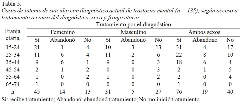 - Acceso a tratamiento a causa del diagnóstico de trastorno mental: se analizó si los pacientes que tenían diagnóstico de trastorno mental asistían a tratamiento psicológico y/o psiquiátrico (en cualquier modalidad) al momento del intento suicida. En función de ello, se contabilizó cada caso en una de tres categorías de tratamiento: Recibe tratamiento (pacientes que al momento del intento suicida asistían a tratamiento); Abandonó tratamiento (pacientes que habían iniciado tratamiento pero que previo al intento suicida lo habían abandonado); No inició tratamiento (pacientes que nunca iniciaron tratamiento pese a haber sido diagnosticados con trastorno mental previo al intento suicida).