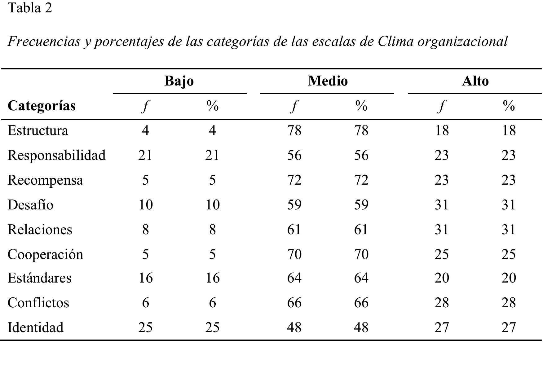 En la tabla 2, se observa que la mayoría de los participantes se ubica en un nivel medio en la percepción de las distintas categorías de clima organizacional evaluadas y de manera prioritaria en estructura, recompensa y cooperación.