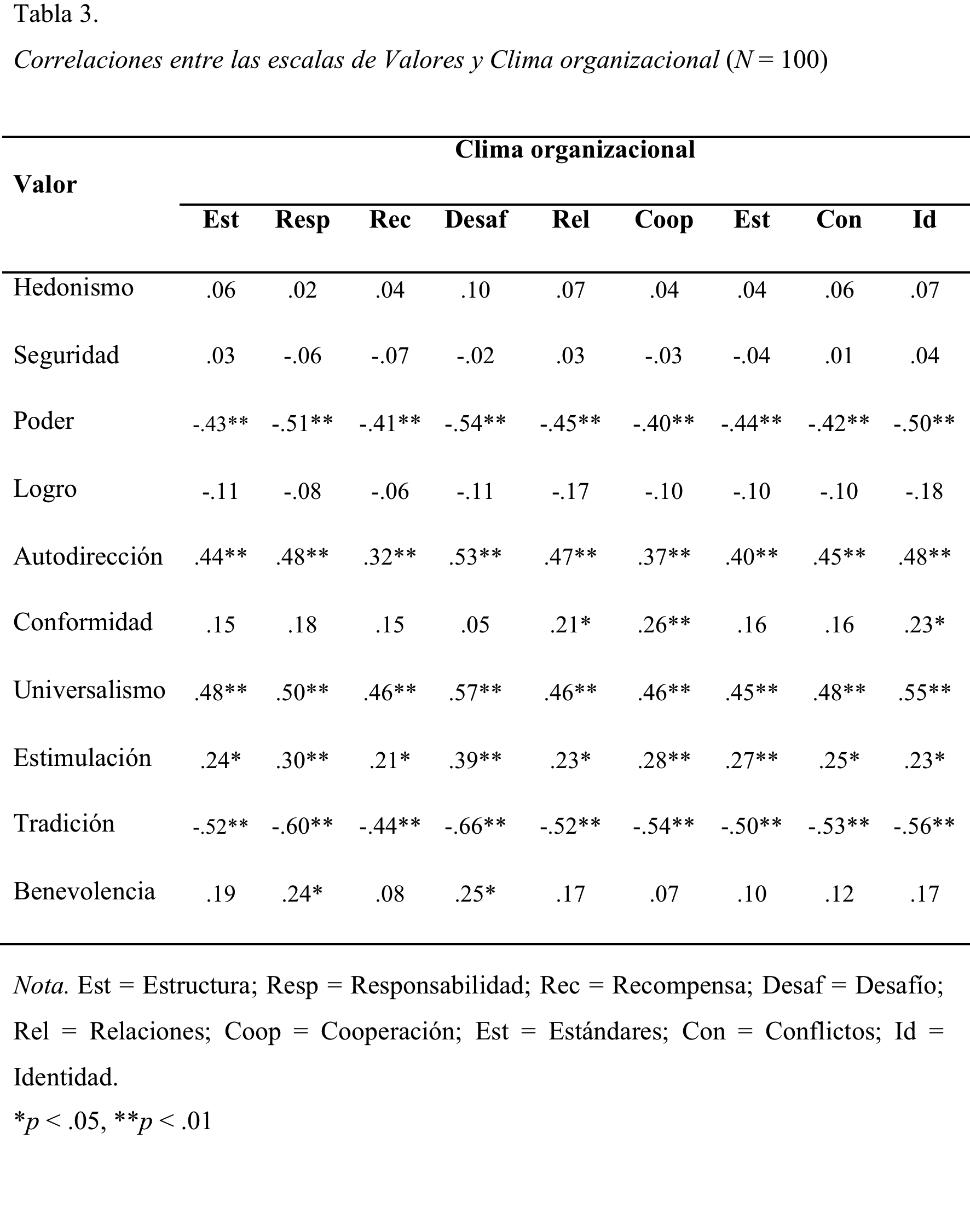 Se observa que las escalas de valores: Poder, Autodirección, Universalismo, Estimulación y Tradición tuvieron una correlación estadísticamente significativa con todas las escalas de clima organizacional (tabla 3), presentándose el grado de correlación más grande entre Tradición (valores) y Desafío (clima organizacional), rs = .66, p < .01, rs 2 = .44, siendo el tamaño del efecto grande (Cohen, 1988).