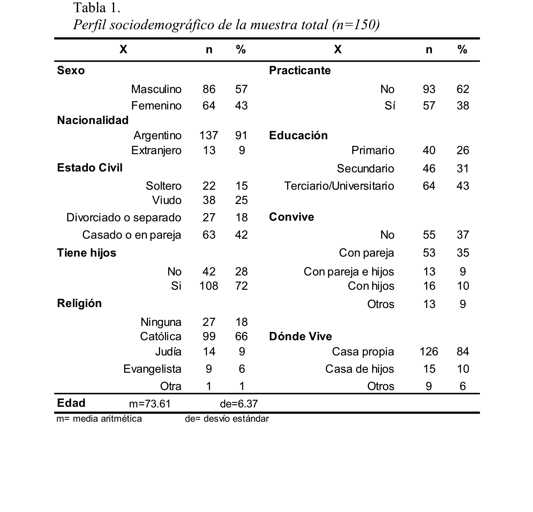La muestra estuvo conformada por 150 adultos mayores autoválidos, de diferente género, mayores de 60 años, de nivel socioeconómico medio, residentes en un gran centro urbano (Ciudad Autónoma de Buenos Aires y conurbano, República Argentina) y que poseían un vínculo laboral estable y formal antes de jubilarse.