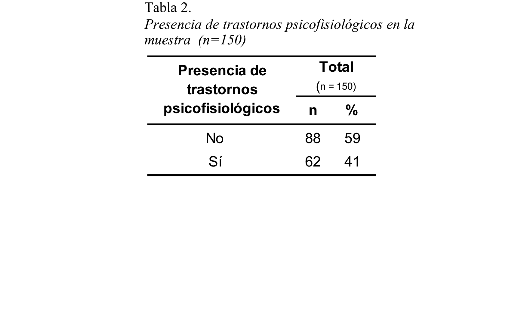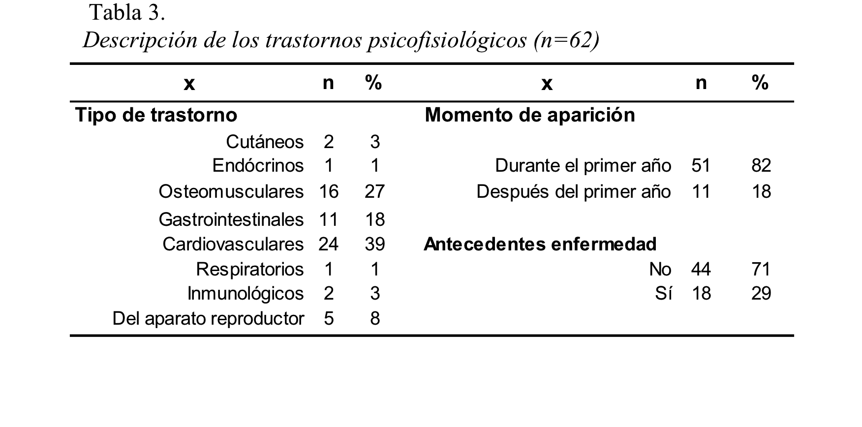 En la tabla 2 y 3 se presentan las frecuencias y porcentajes de los trastornos psicofisiológicos presentes en la muestra. En ellas se observa que el 59% de la muestra no informó sobre la presencia de algún trastorno psicofisiológico. Por su parte, aquellos que informaron nuevos trastornos psicofisiológicos asociados a la jubilación, reportan que el 39% son de tipo “cardiovasculares” y el 27% “osteomusculares”, habiendo acaecido en un 82% “durante el primer año” posterior a haber dejado de trabajar por la jubilación y, en un 71%, sin poseer antecedentes de salud.